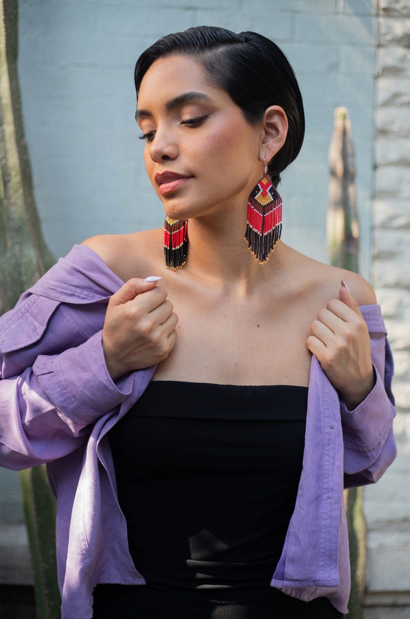 Exuding timeless elegance, the Aristocrat earrings are a true statement of sophistication and style. Handmade with intricate beaded craftsmanship, these earrings feature a rich blend of red, black, and burgundy hues, highlighted with a touch of gold for an added layer of luxury. The native-inspired design brings a bold yet refined balance of colors, making them the perfect accessory to elevate any outfit. With their handmade artistry, the Aristocrat earrings are a stunning celebration of bold, confident beauty, adding a regal flair to your collection.