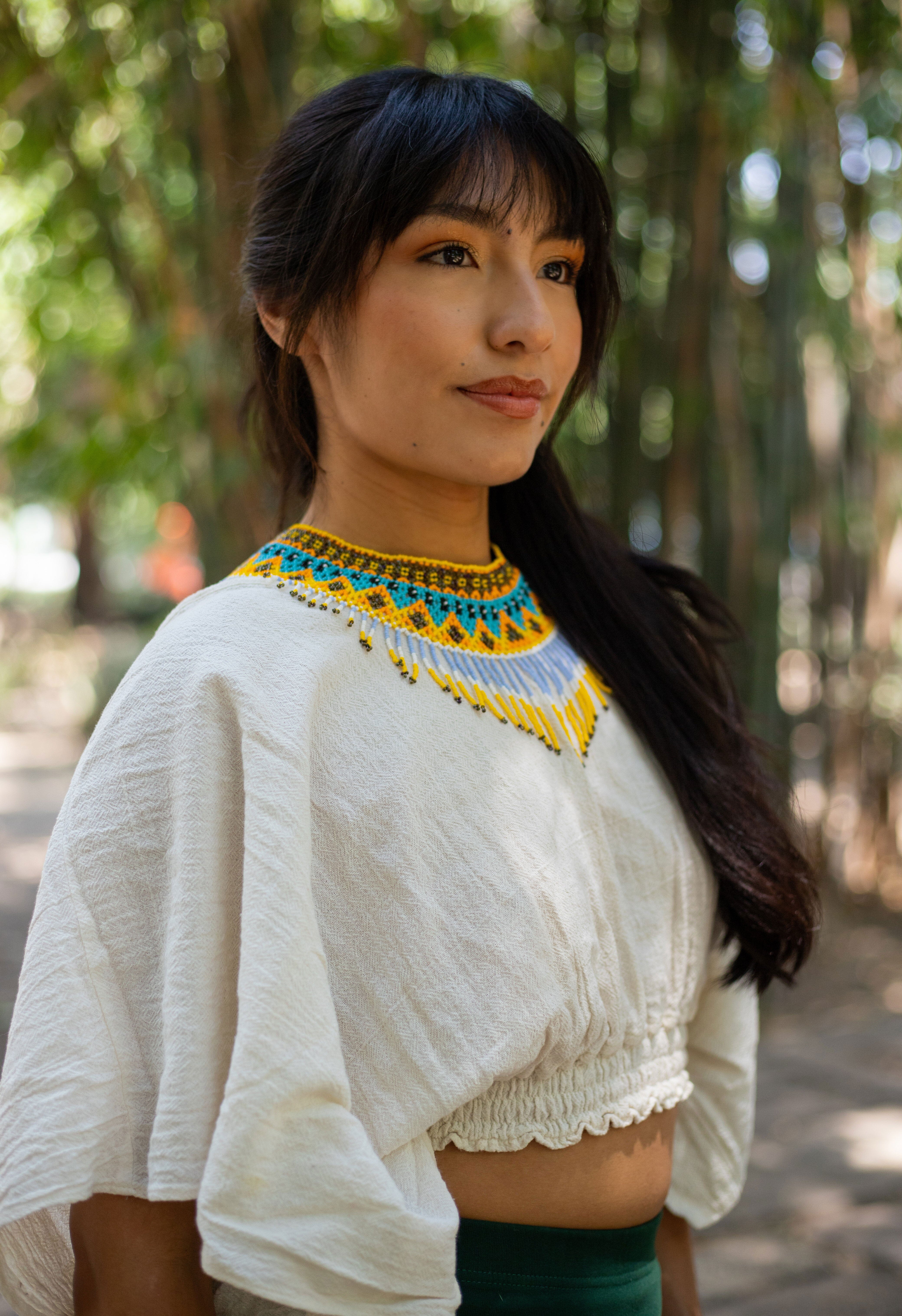 Inspired by the vibrant colors of a spring bloom, the Sunflower Seeds Choker brings a burst of energy to your style. Handmade with intricate beaded craftsmanship, this choker features a beautiful blend of yellow and blue hues, evoking the bright, cheerful spirit of daisies in full bloom. The native-inspired design captures the essence of nature's simplicity, while the handmade artistry gives it a unique, personal touch. Perfect for adding a playful yet elegant pop of color, the Sunflower Seeds Choker is a statement piece for any occasion.
