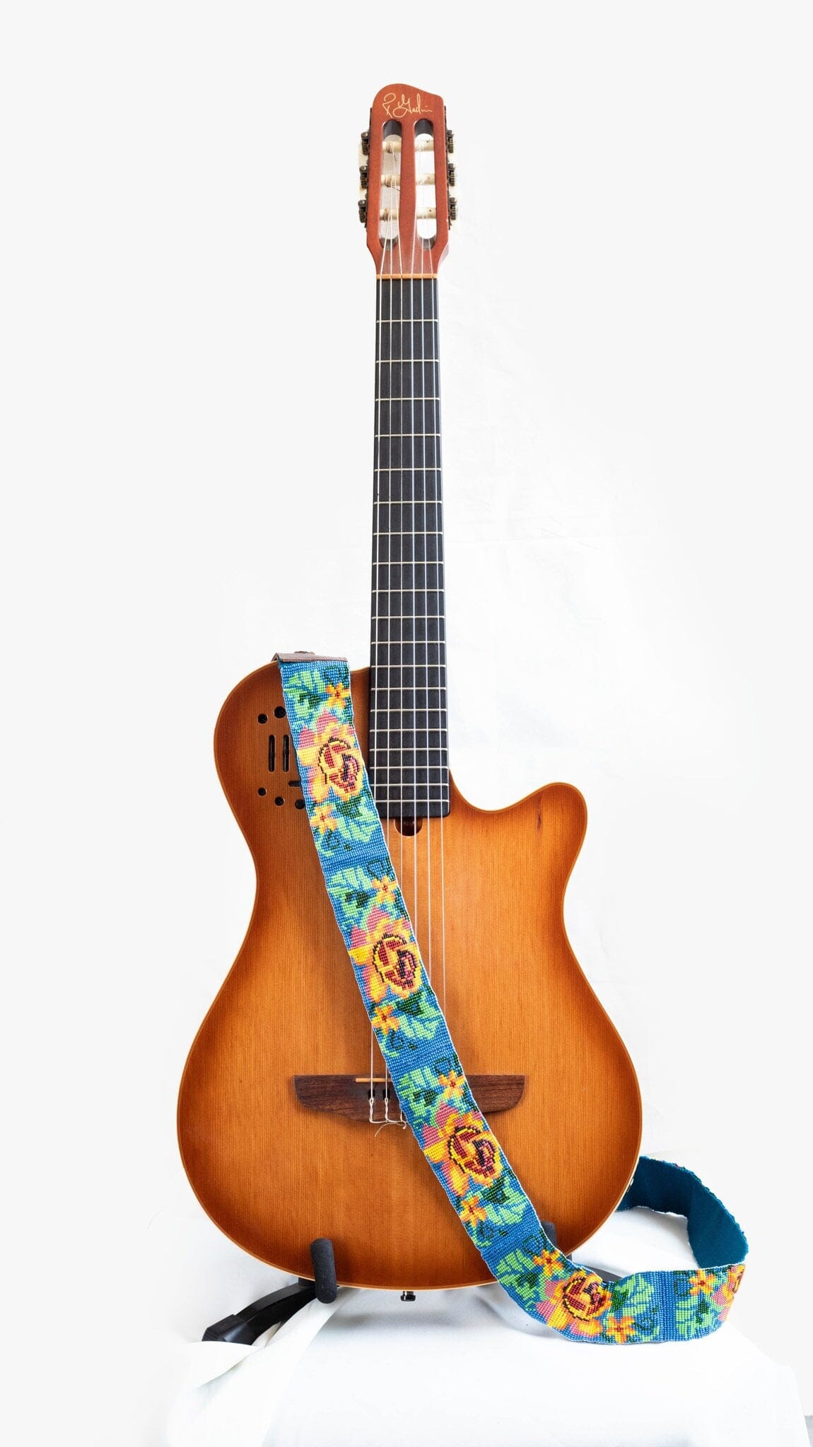 Embrace the soulful spirit of the Joplin guitar strap, featuring a stunning Texas rose delicately beaded against a rich blue background. This captivating design is a tribute to the boldness and beauty of musical expression, much like the legendary artist it’s named after. The vibrant rose blooms with passion, while the deep blue provides a timeless contrast, creating a look that’s both elegant and edgy. Whether you’re belting out powerful ballads or strumming soft melodies, the Joplin guitar strap adds a touch of iconic style to every performance.