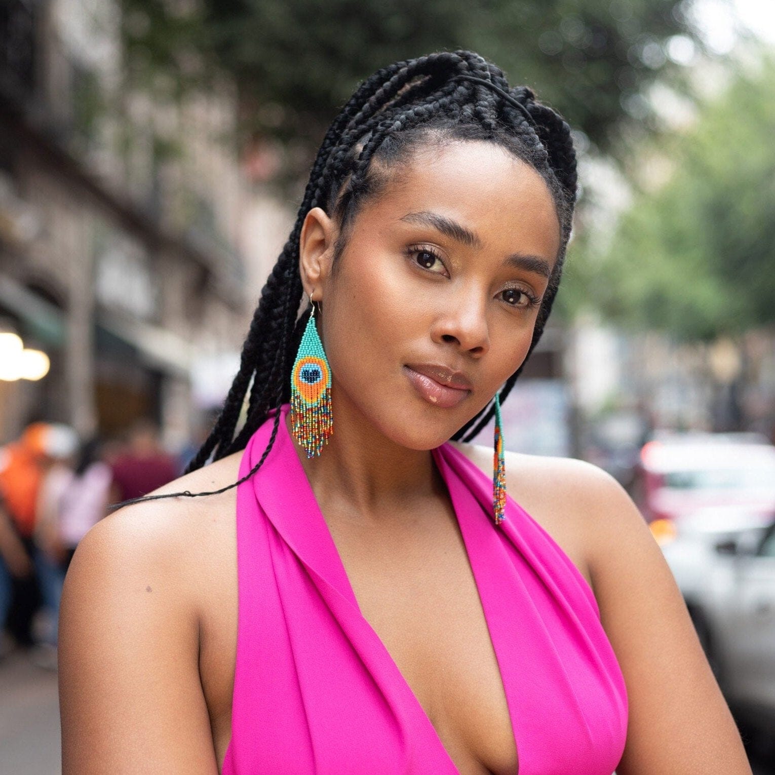 Renowned for its flamboyant plumage, the peacock, or Pavo Real in Spanish, takes immense pride in its appearance. Just like this majestic bird, you too can revel in standing out with our Pavo Real beaded earrings. Featuring a showy burst of loud colors, a bold, heart-shaped pattern and a shimmering rainbow fringe, these masterfully handmade beaded earrings will immediately become a symbol of your vibrant and confident style. 🦚