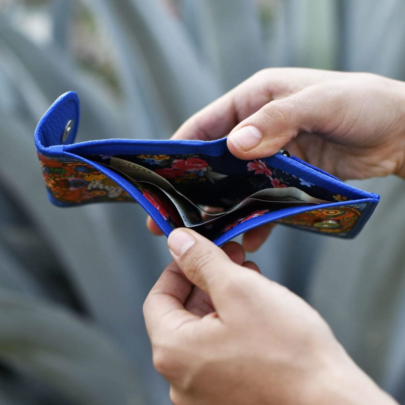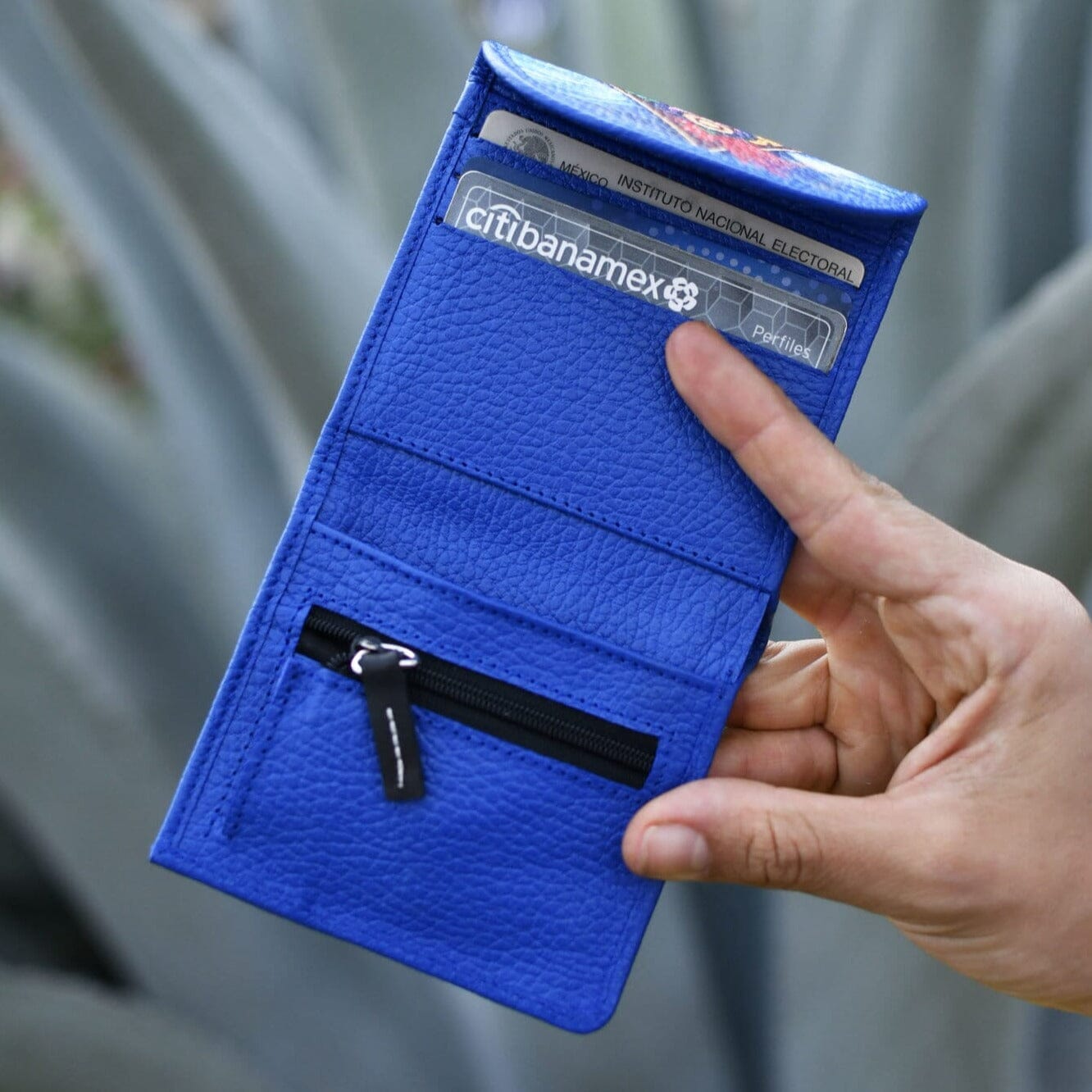 Immerse yourself in the delicate artistry found within Mother Sierra's latest collection of leather unisex wallets, each meticulously handmade from genuine premium leather and embellished with stunning prints of large-scale paintings and murals. Crafted with the utmost care and attention to detail, these wallets seamlessly blend masterful artistry and durable functionality. The Berry Basket lays out a bountiful lush harvest of vibrant mouth-watering tropical fruits ferried over azure blue water. Carry your everyday essentials with these exquisite creations, where the beauty of these masterful artworks meets the timeless quality of genuine leather craftsmanship.