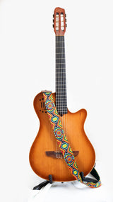 Ignite your performance with the Santana guitar strap, featuring an electrifying mix of fiery reds, deep blues, and vibrant yellows. This hand-beaded masterpiece captures the essence of rhythm and soul, much like the legendary music that inspired it. The bold, intricate design channels a vibrant energy, offering both comfort and visual impact. Whether you’re delivering smooth, melodic tunes or dynamic riffs, the Santana guitar strap is the perfect accessory to elevate your playing and make every note come alive.