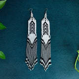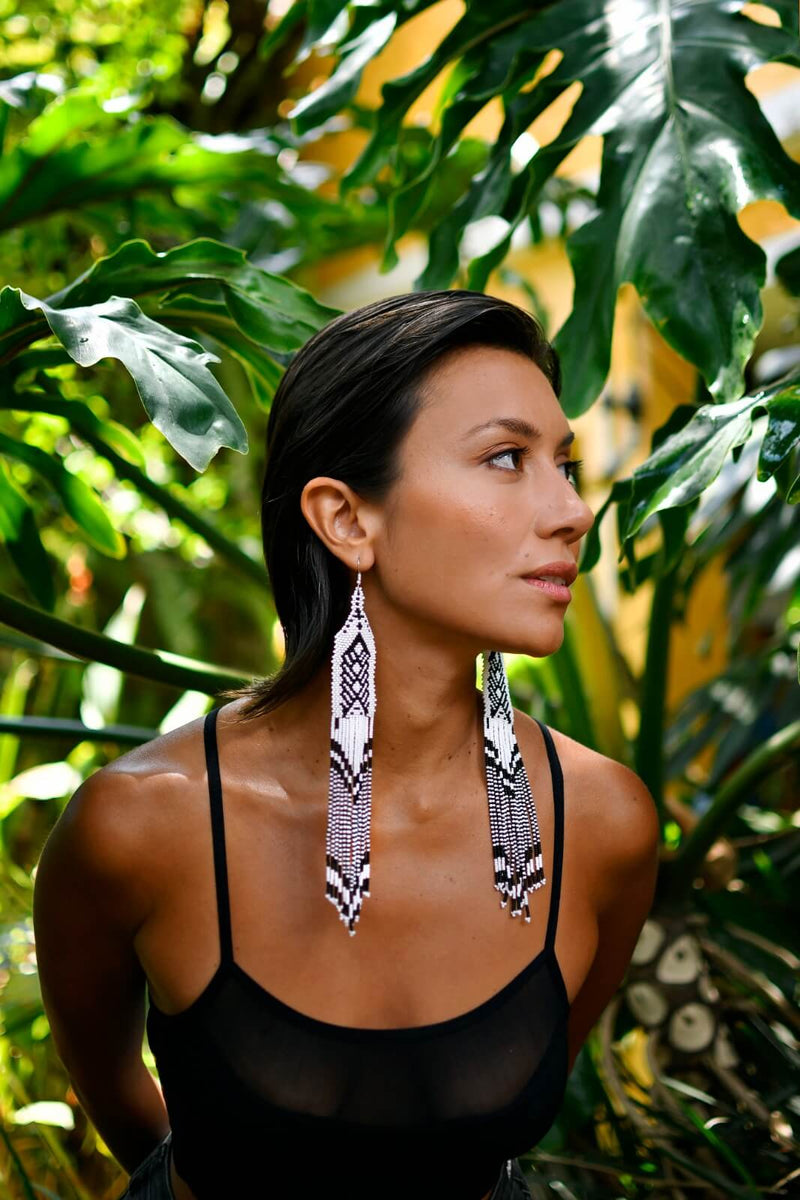 Echoing the powerful grace of rushing waterfalls, our Cascadas beaded earrings flow elegantly down and will envelop your shoulders in their misty beauty. Their versatile monotone long fringe design allows you to effortlessly highlight colors in your outfit or introduce a pop of white to your ensemble, making them a dramatic handmade addition to the rest of your beaded collection! ☯