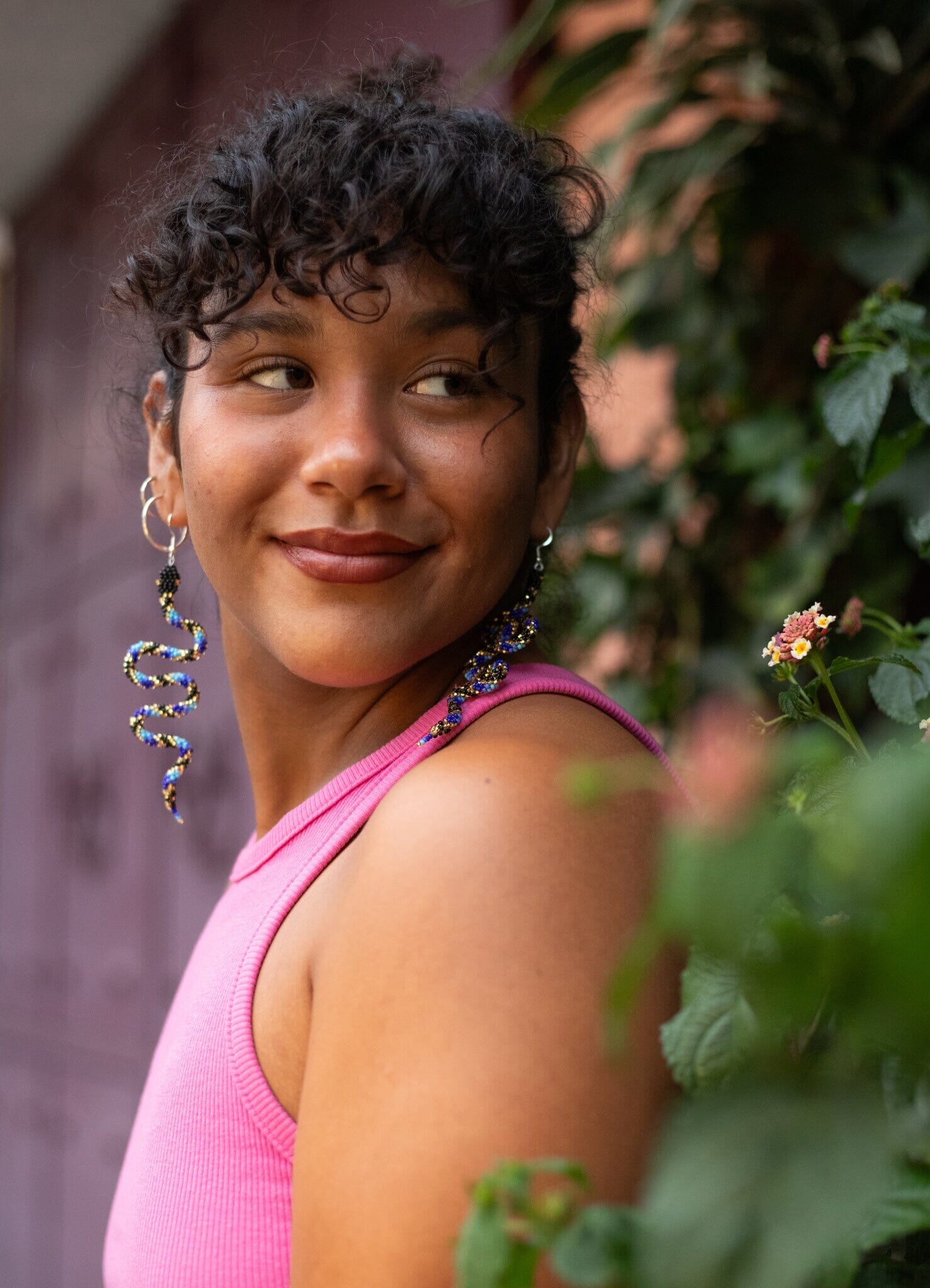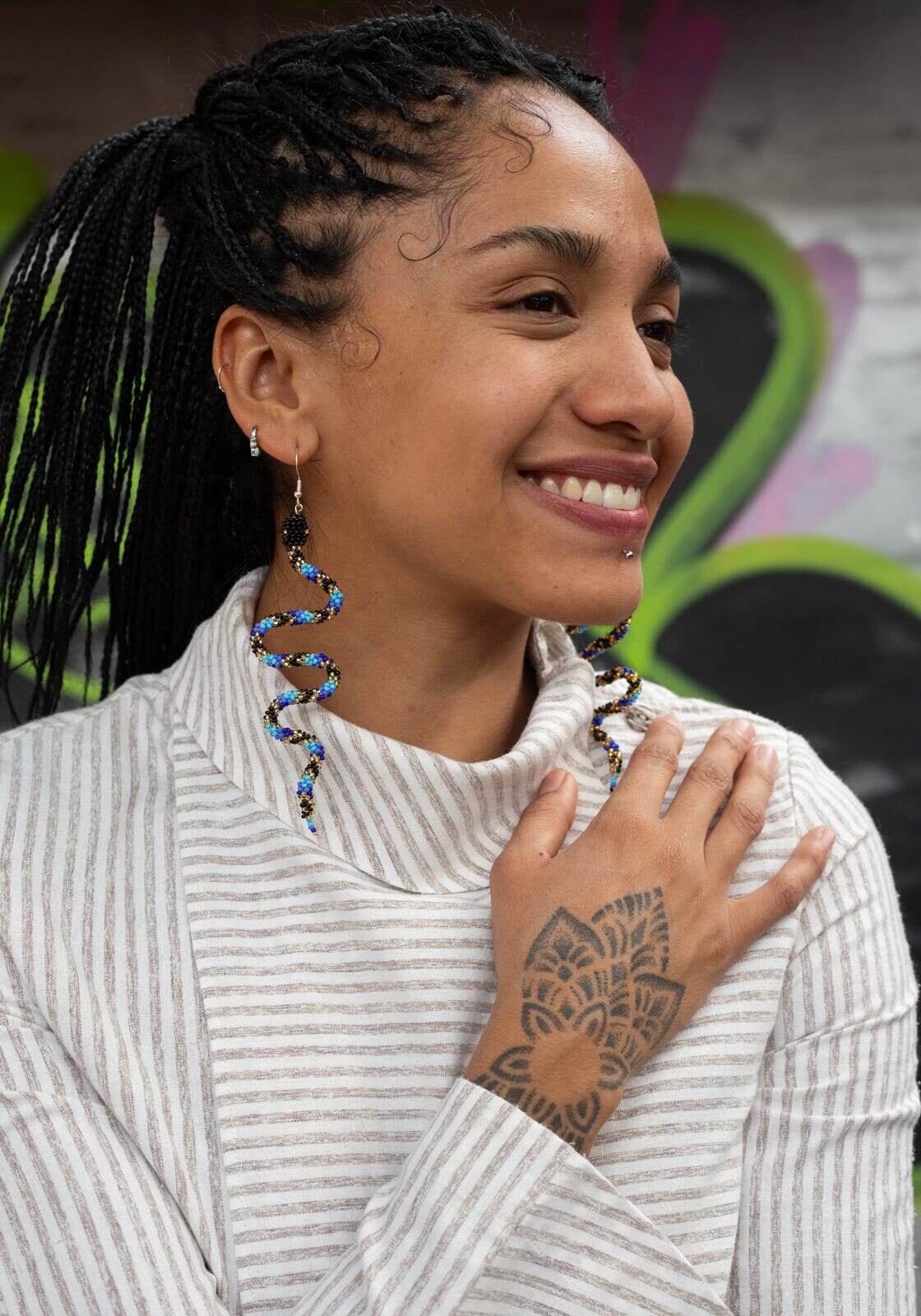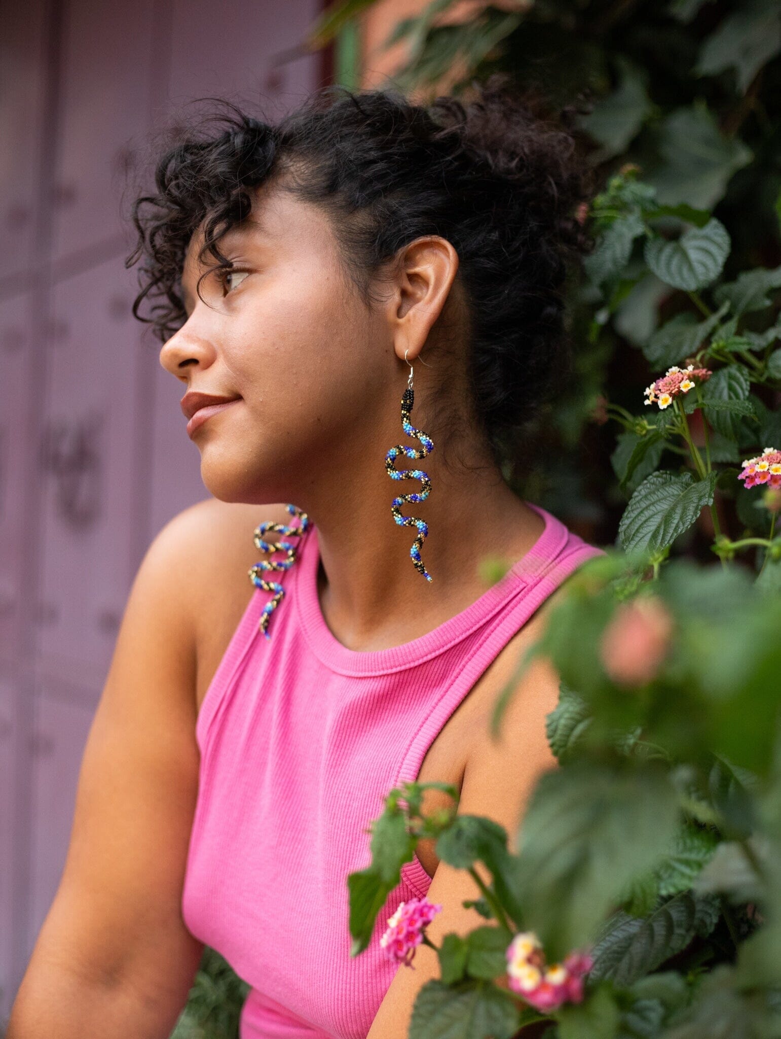 Embrace the mystique of our Delilah beaded snake earrings, a serpentine masterpiece in bold shades of blue, black, and gold. These captivating snakes channel the essence of a modern enchantress, weaving a slithering story of dramatic elegance as these beaded serpents gracefully dangle, making a striking statement that complements your beauty with a touch of the extraordinary. 🐍💙✨
