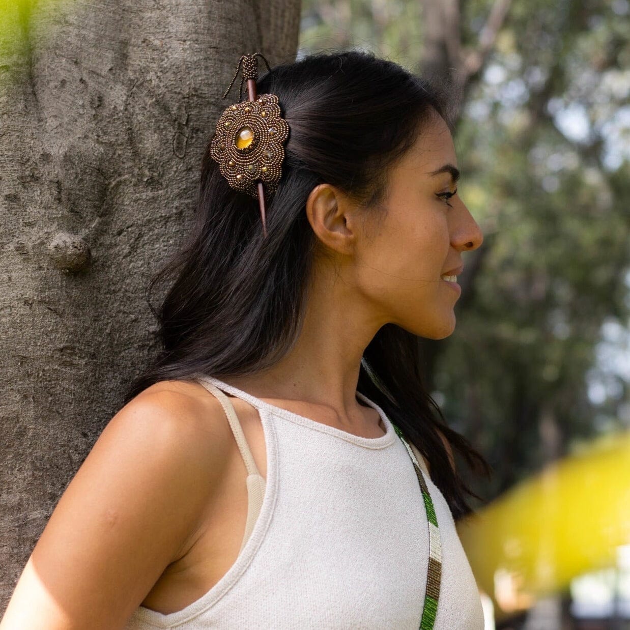 Experience the essence of refined elegance with our Espresso beaded hair barrette. Inspired by the rich and velvety tones of a freshly brewed cup, this piece exudes sophistication and will awaken your senses, immersing you in a world of aromatic indulgence.
