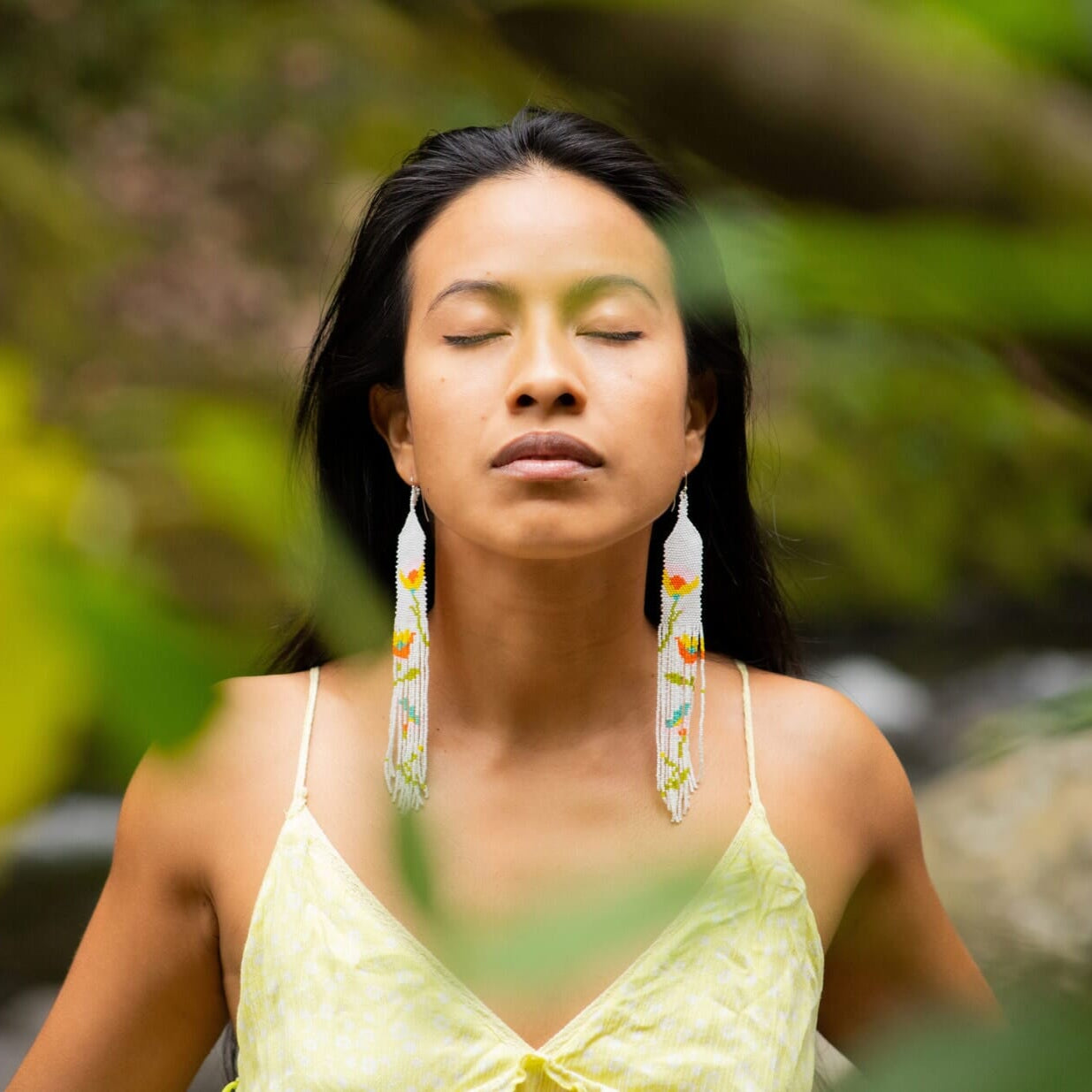 Soft, elegant, and timeless, the Juliet earrings are a delicate expression of beauty. Handmade with intricate beaded craftsmanship, these earrings feature a gentle white hue, with a subtle, delicate flower pattern that adds an airy, romantic touch. The native-inspired design brings a refined and graceful energy, making these earrings a perfect complement to any look. Crafted with care and attention to detail, the Juliet earrings embody handmade artistry, offering a sophisticated statement that celebrates nature's quiet elegance.