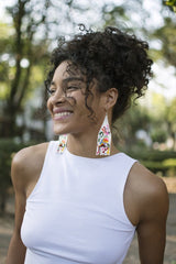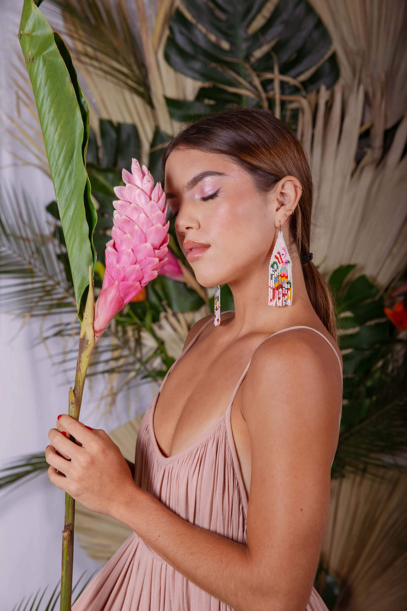 Otomí colorful bright tenango pink white fringe beaded earrings