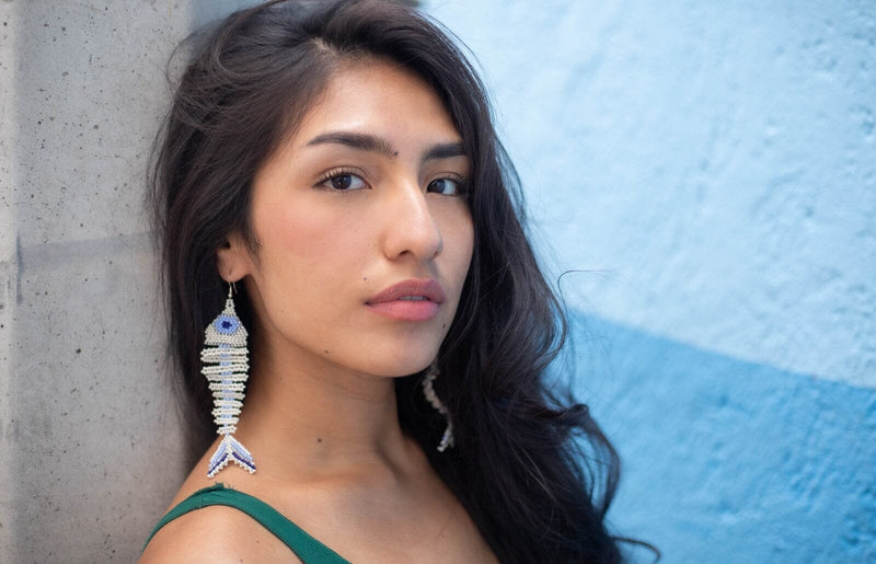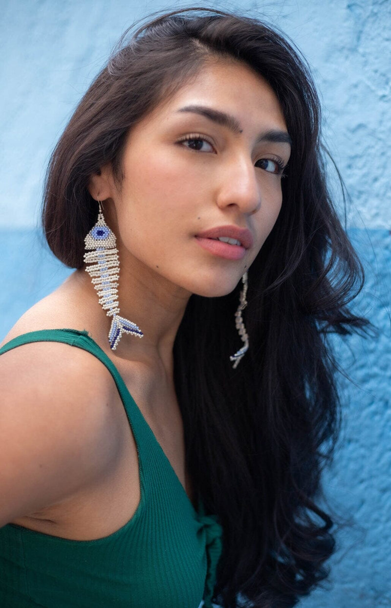 Experience the ethereal beauty of the Pearl of the Nile beaded earrings, a sibling to our beloved Laguna design. Crafted in the same bone-white hue, these earrings are adorned with delicate light blue beaded accents that evoke the tranquil flow of a timeless river. Let this intricate animal design grace your ears, a testament to the allure of nature’s delicate mysteries.
