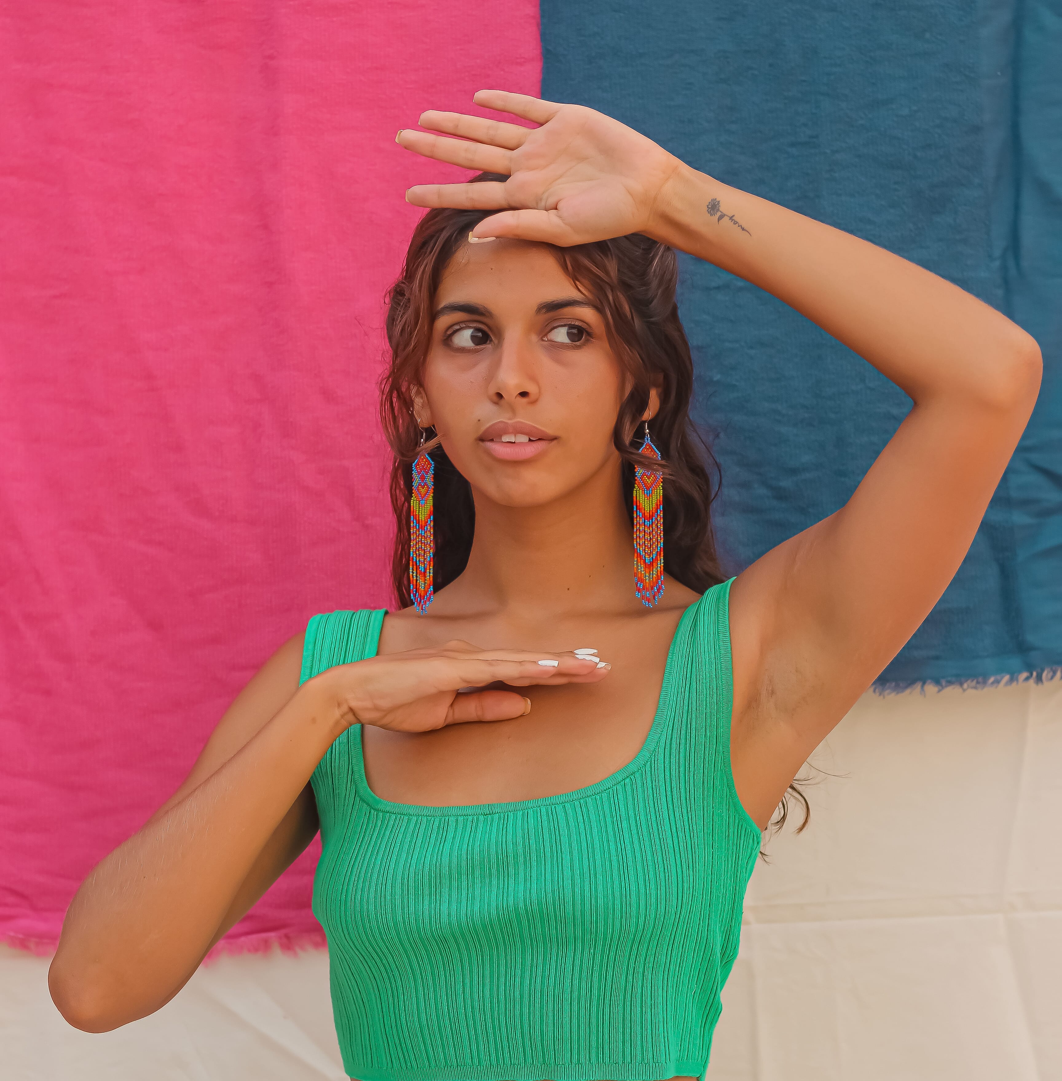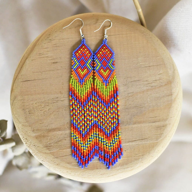 Drawing inspiration from the vibrant Quetzal bird found in Mexico, our Quetzal beaded earrings pay homage to its remarkable beauty. Evoking the bird's brilliant tail feather, these earrings are meticulously designed with scores of ultra-fine micro beads, arranged masterfully to create a vibrant eye-catching pattern that truly dazzles. Embrace the essence of the Quetzal and adorn yourself with this popular fringe piece that captures its radiant spirit and adds a touch of elegance to your style.