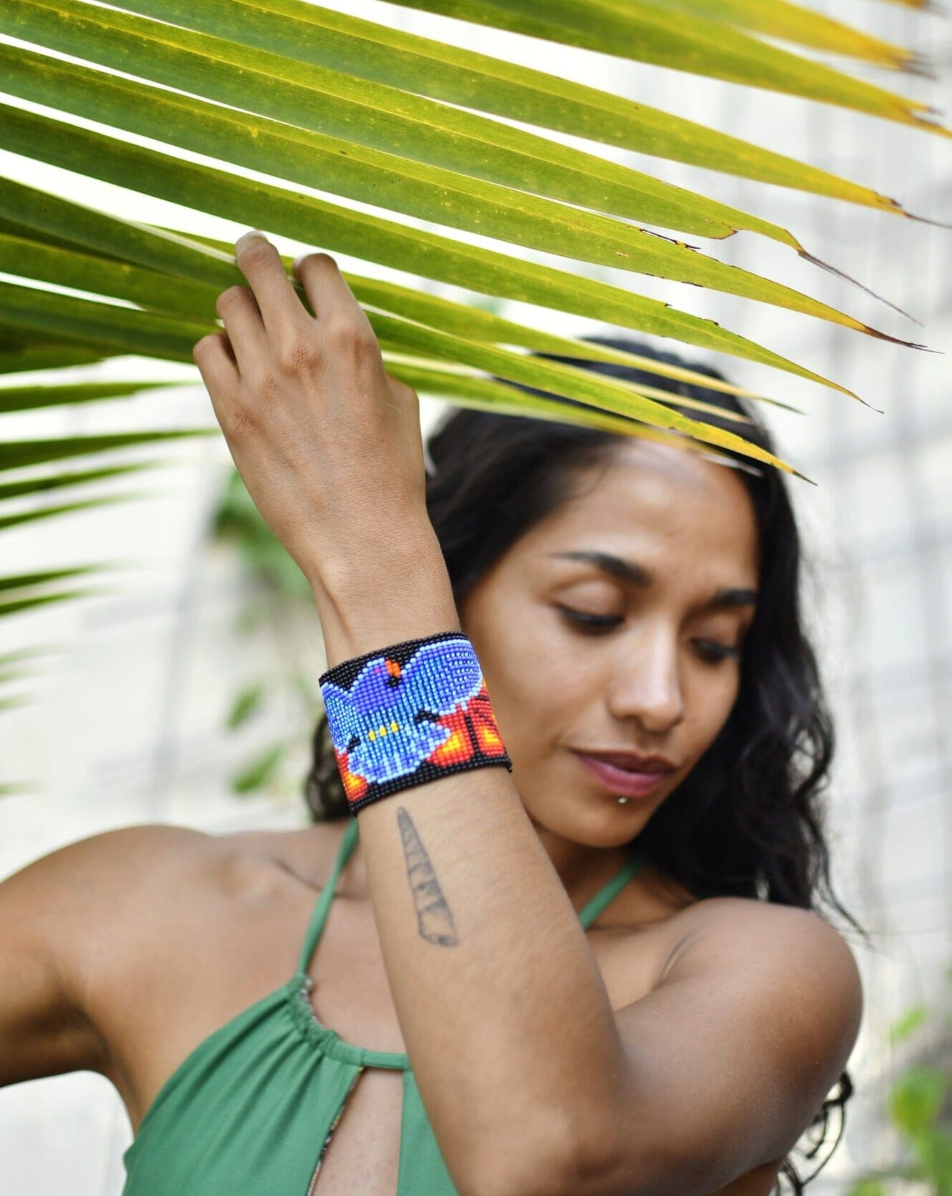 Embrace the triumphant spirit of the brilliant Rising Glory beaded bracelet. Adorn your wrist with the timeless emblem of peace that is the glowing blue dove with its wings gracefully outstretched, as red dahlias burst forth from behind it with passionate intensity. Let this meticulously handcrafted cuff be a poignant reminder that the beauty of nature is boundless and resilient and will triumph over even the darkest moments.