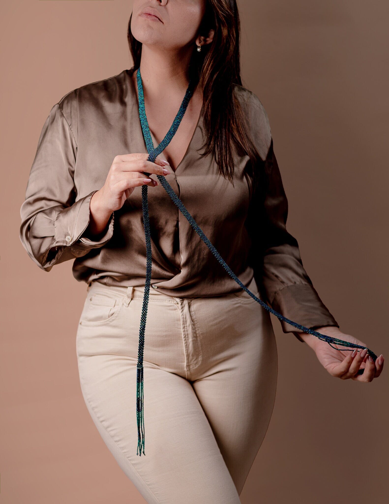 Our trendy Metallic Teal beaded skinny scarf is a sleek, glamorous accessory designed for those who love a touch of sparkle. Handcrafted with shimmering metallic teal beads, this extra-long, narrow scarf wraps neatly around the neck for a modern, chic look. The lustrous beads catch the light with every movement, giving off a mesmerizing shine that adds sophistication to any outfit. Whether you’re dressing up for a special occasion or elevating a simple look, this skinny scarf offers a perfect combination of boldness and refinement, all while remaining lightweight and comfortable