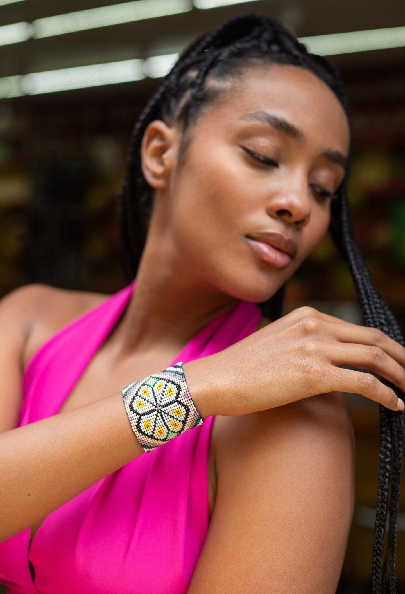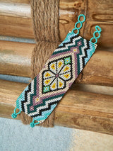 Catch the sunlight high and kiss the summer sky with this blissful garden of color. With its exquisite craftsmanship and vibrant hues, the Sophia beaded bracelet will captivate and beautifully complement your radiant style. Let this bright cuff sparkle vivid, clean and pure upon your wrist!