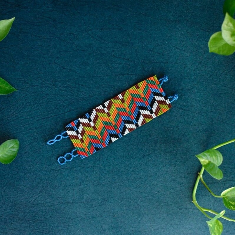 Our Stone Ridge beaded bracelet not only brings the impressive clarity of stacked-stone masonry to your wrist but also infuses it with a burst of bold, vibrant colors. Each stone-inspired block of color woven together boasts a kaleidoscope of rich and energetic tones, as a painter's palette comes to life in a beaded cuff.