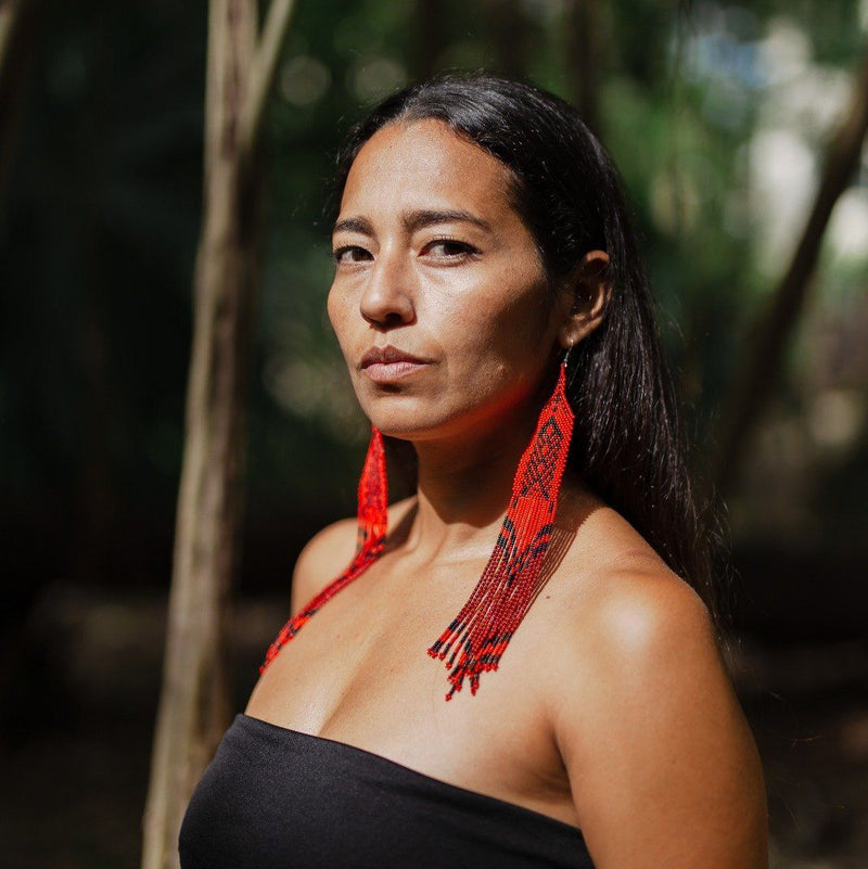 Mexico's rich volcanic landscape finds true artistic embodiment in our Volcanes beaded earrings, which capture the dynamic and flowing energy of lava-laden landscapes, ensuring you make a striking statement wherever you go. Crafted to mirror the spectral essence of these geological marvels, these long handmade earrings fuse nature's raw power with an elegant design. Explosive and dramatic, feel the heat as the deep red fringe cascades elegantly over your shoulders, like long rivers of hot flowing lava.